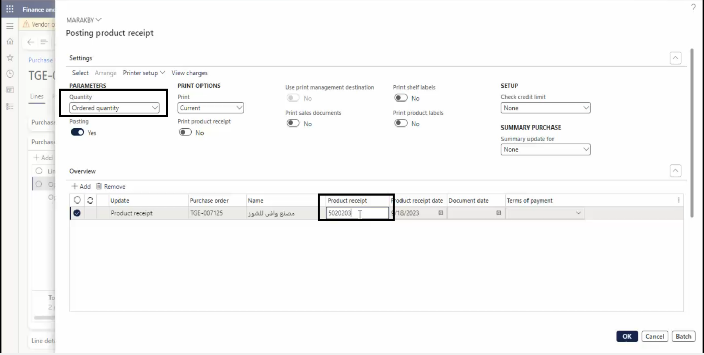 - Choose Ordered Quantity then enter the Product Receipt the Press OK.