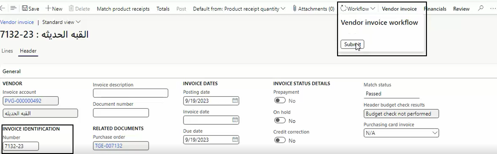 3. From Header identify the Invoice identification then from Workflow press submit.