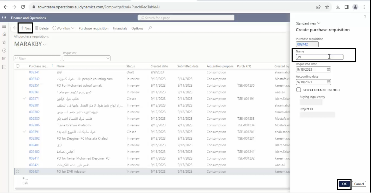 - Press New then enter the Name of Purchase Requisitions.