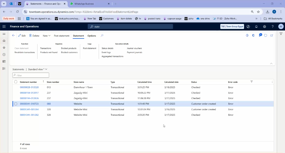 - بفتح صفحة Statements وبشوف الحركات اللي حالتها Error.